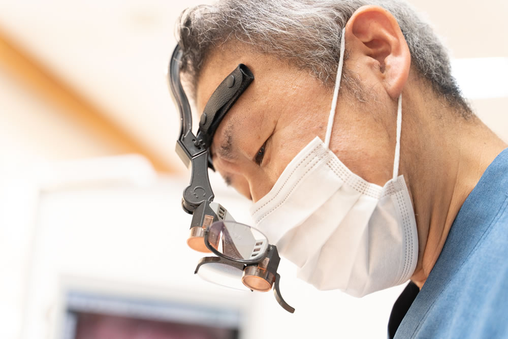 肉眼2.5倍に視野を拡大できる歯科拡大鏡です。細部の状態を目で確認しながら、精密な処置を実施いたします。