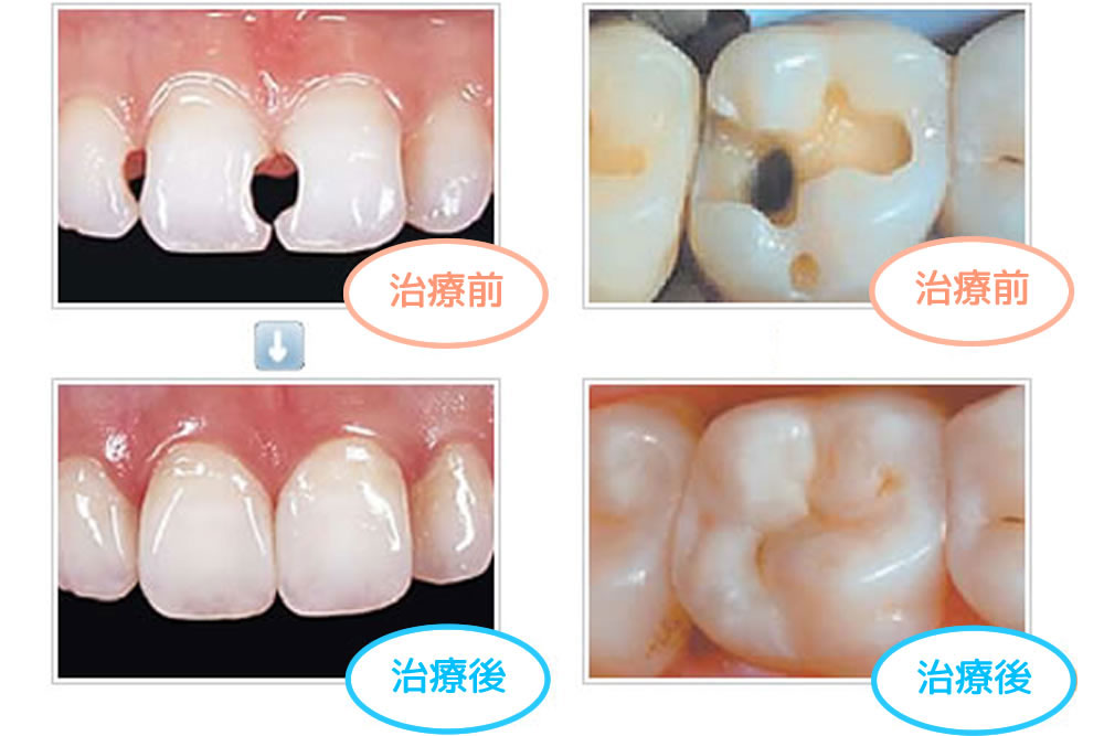 ダイレクトボンディングは、欠損部に歯科用の樹脂を直接盛り足し、その場で形態を整える修復法です。歯の切削量を最小限に抑えられる上に型取りなどの工程がないため、即日で治療が完了します。